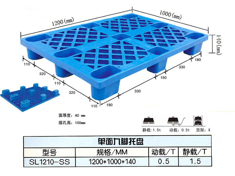 注:九腳網(wǎng)格托盤內(nèi)部可加入鋼管,是為了達(dá)到增加承載的目的,延長托盤的使用壽命,塑料托盤如要在低溫環(huán)境中長期使用,要選擇全新料生產(chǎn)的產(chǎn)品。